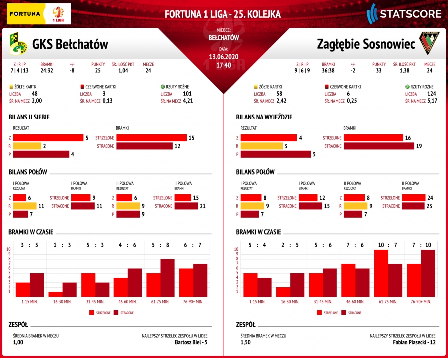 Kiedy obie drużyny strzelały do tej pory gole? Bełchatowianie do przerwy 9 a w drugiej połowie 15, natomiast rywale odpowiednio 12 i 24 (!). Giekasiacy najwięcej, bo sześć trafień zaliczyli w ostatnim kwadransie meczów, natomiast sosnowiczanie 10 zdobyli w przedostatnim kwadransie. Więcej ciekawostek na grafice przygotowanej przez STATSCORE – oficjalnego dostawcy statystyk dla klubów Fortuna 1 Ligi.