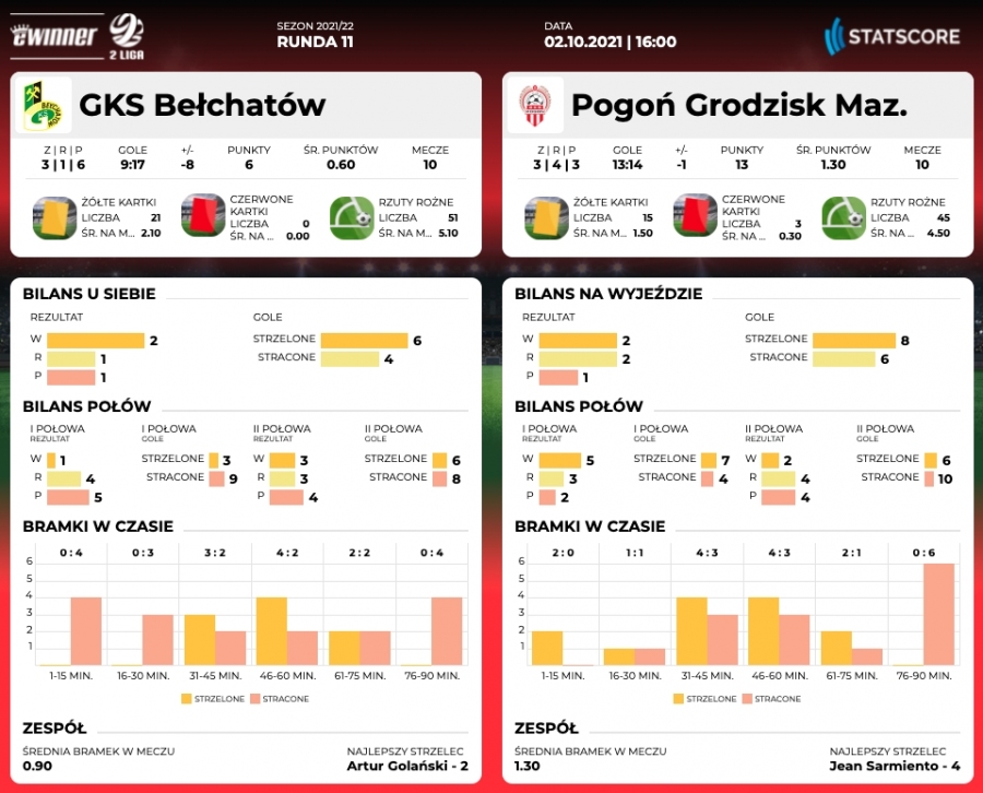 Kiedy obie drużyny strzelały do tej pory gole? Bełchatowianie w pierwszej połowie zdobyli 3 bramki, po zmianie stron 6. Połowa tych goli została zdobyta w pierwszym kwadransie drugiej części meczu. Rywale natomiast 7 do przerwy i 6 po niej. GKS na razie dwukrotnie kończył swoje mecze z czystym kontem a Pogoń raz - w pierwszej kolejce.